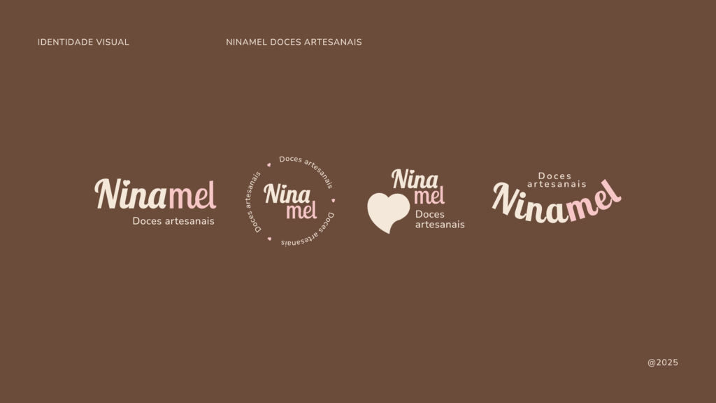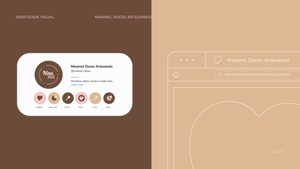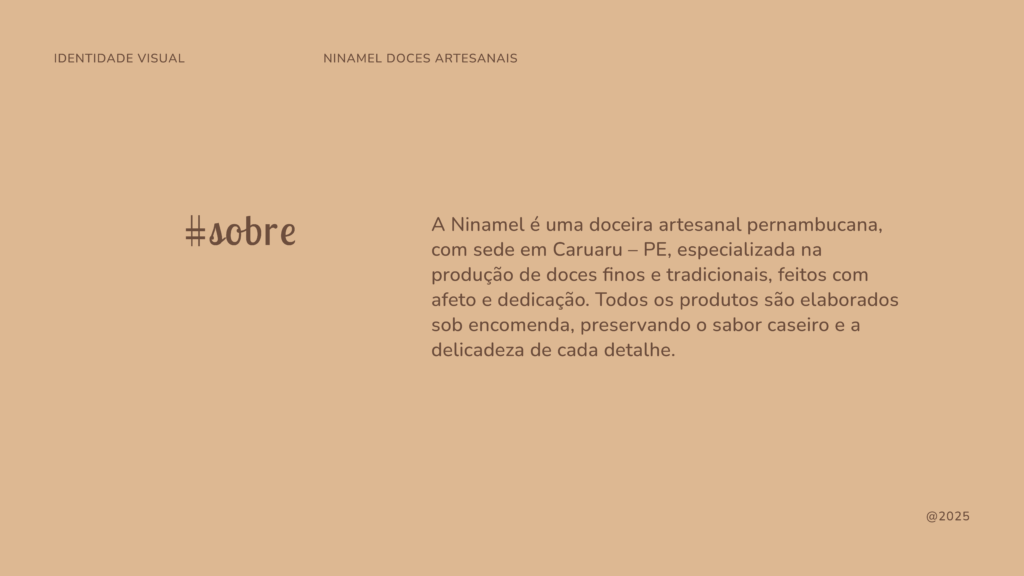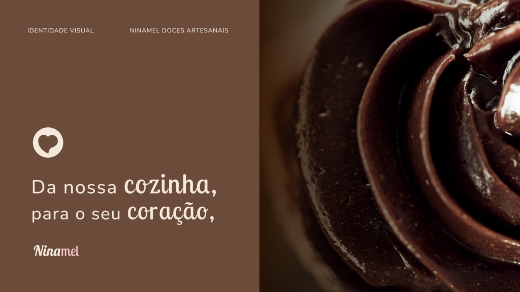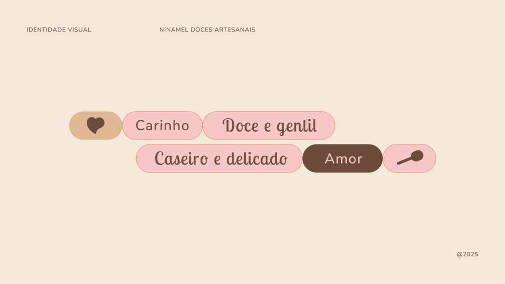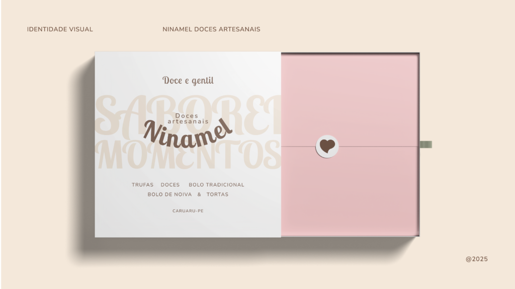 A marca foi concebida para transmitir afetividade, delicadeza e o valor do artesanal, fortemente conectada à ideia de momentos especiais criados com cuidado e atenção aos detalhes. O uso do termo “Doce e gentil”, logo no topo, define com precisão o tom da marca: acolhedor, humano e emocional.