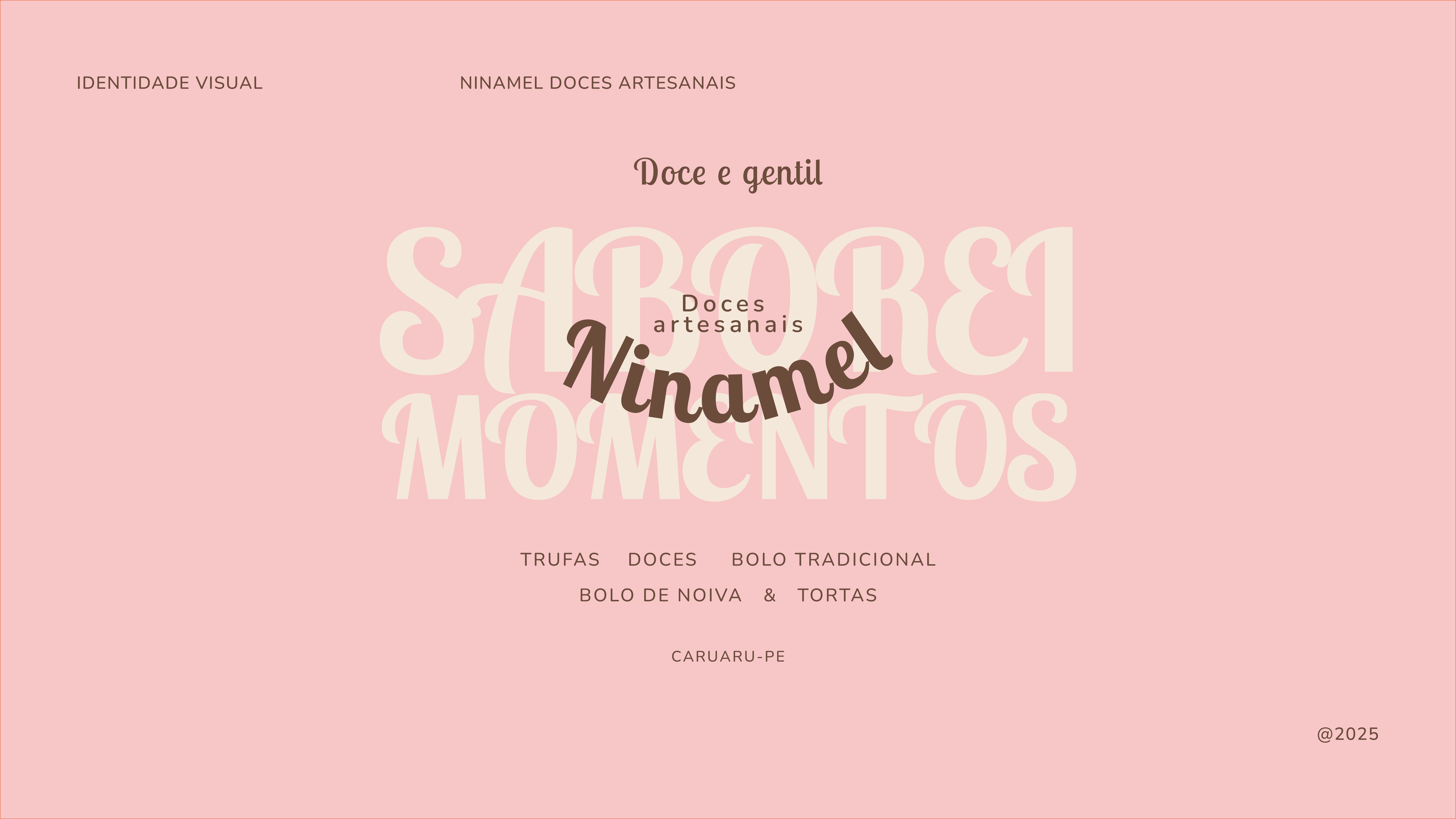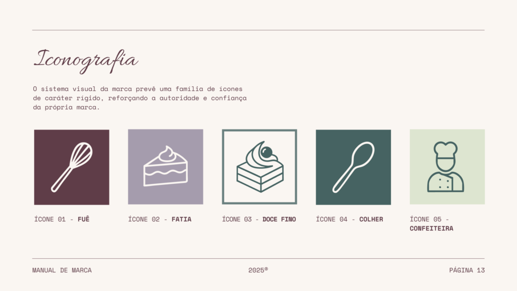 O símbolo complementa o logotipo com uma representação sutil do universo da confeitaria, fortalecendo a identidade visual sem competir com o lettering. O conjunto sustenta um posicionamento premium, atemporal e memorável.