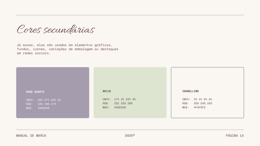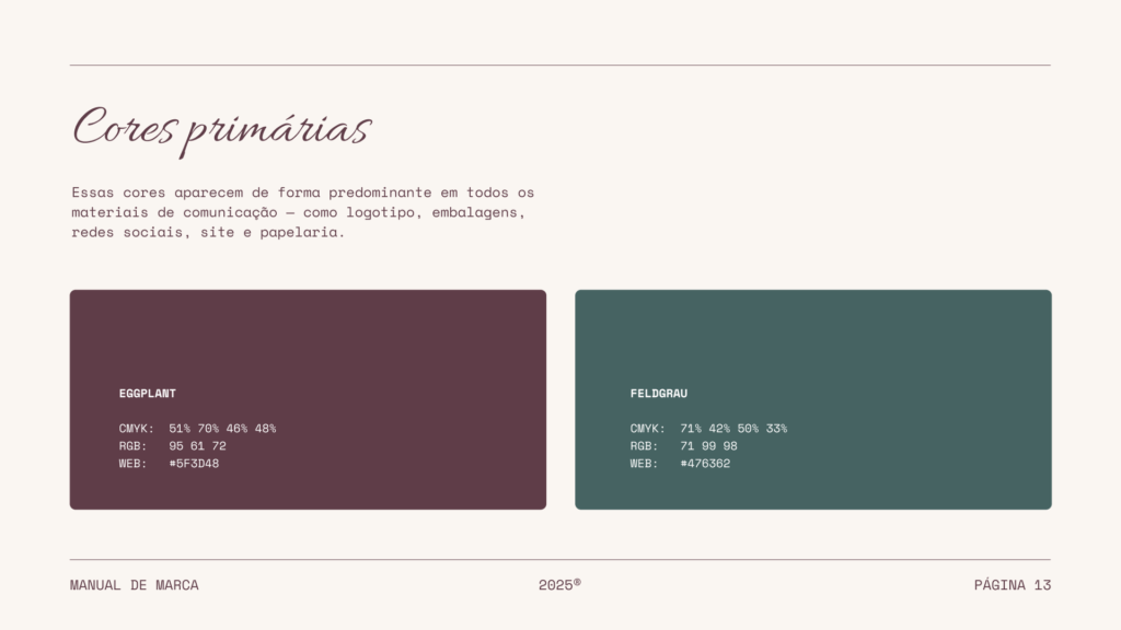 Cor principal da marca, transmite elegância, profundidade e um caráter afetivo, remetendo à doçura sofisticada.
