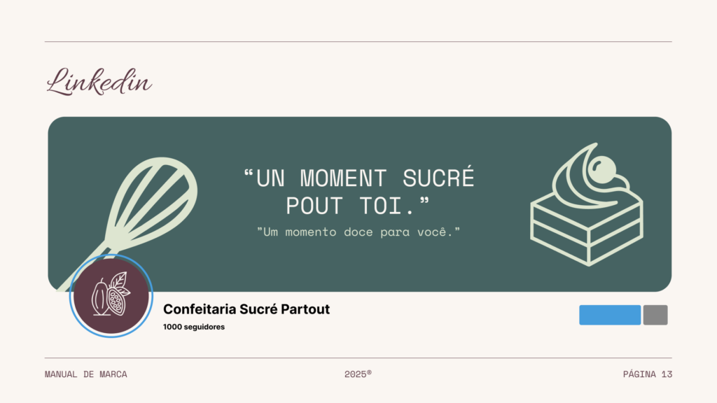 Seu posicionamento valoriza o tempo, o detalhe e o afeto, refletindo uma confeitaria que respeita processos artesanais e celebra ocasiões especiais com delicadeza e sofisticação. O slogan “Un moment sucré pour toi” reforça essa proposta intimista, pessoal e acolhedora.